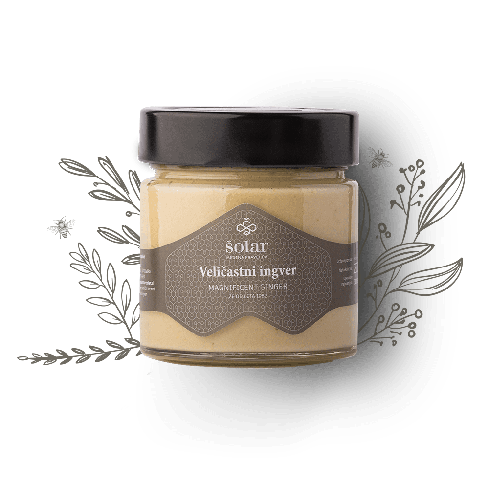Veličastni ingver je mešanica kremnega medu in suhega ingverja, ki medu dodajo topel, rahlo pekoč in osvežujoč okus. Kombinacija sladkobe medu in intenzivnega ingverjevega okusa je prijetna in hkrati blagodejna, saj skupaj podpirata dobro počutje ter pomagata pri prehladnih obolenjih, vnetem grlu in krepitvi imunskega sistema.